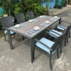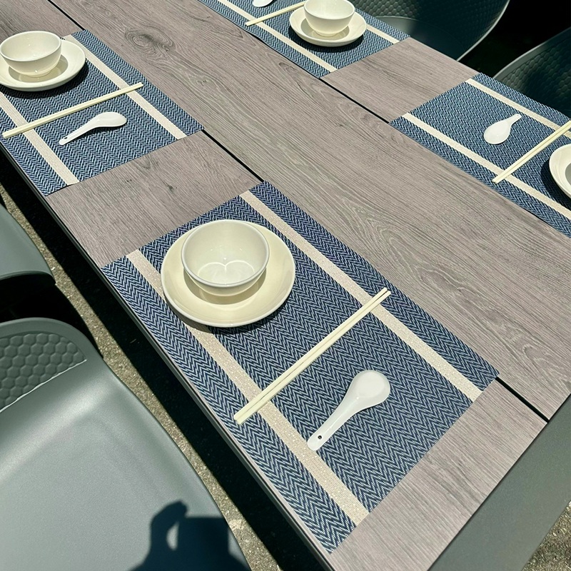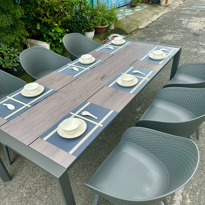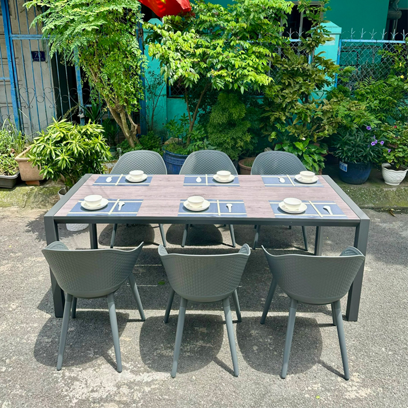 Bề mặt bàn được làm từ gỗ nhựa Duraboard giả gỗ tự nhiên, tạo cảm giác ấm áp nhưng vẫn đảm bảo khả năng chống thấm, chống cong vênh và chịu được nắng mưa. Khung bàn được cấu tạo từ hợp kim nhôm sơn tĩnh điện, chống gỉ sét tuyệt đối, giúp bạn yên tâm sử dụng ngoài trời trong thời gian dài.