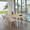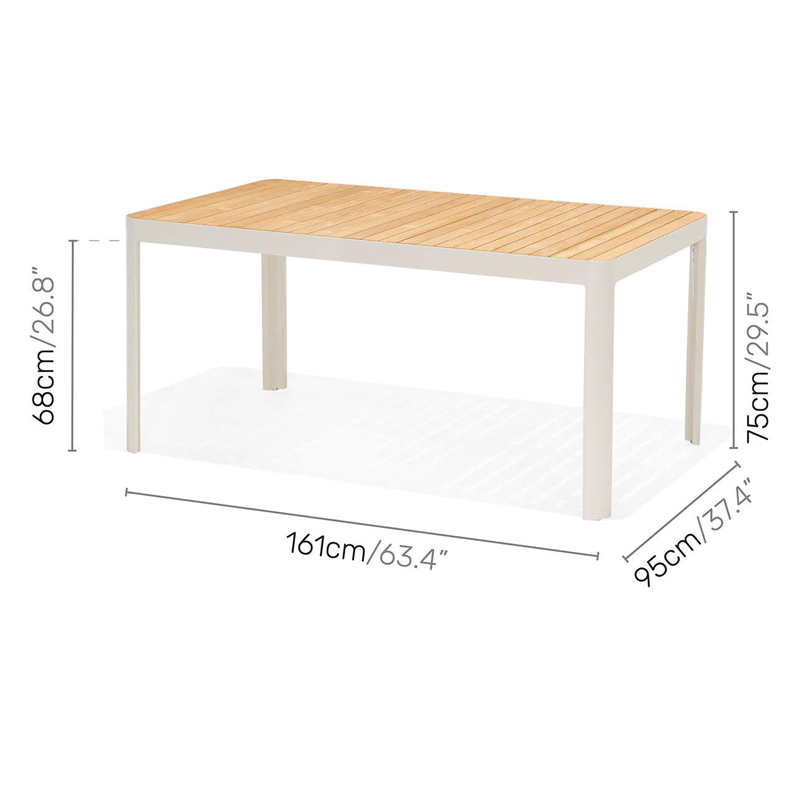 Mặt bàn: Gỗ TEAK tự nhiên – được mệnh danh là “vua của các loại gỗ ngoài trời”, có độ cứng cao, kháng nước, kháng mối mọt và chịu được thời tiết khắc nghiệt.