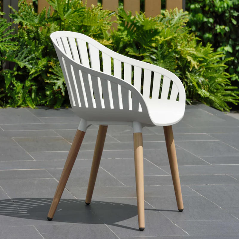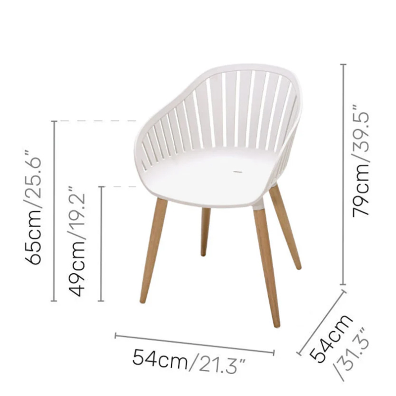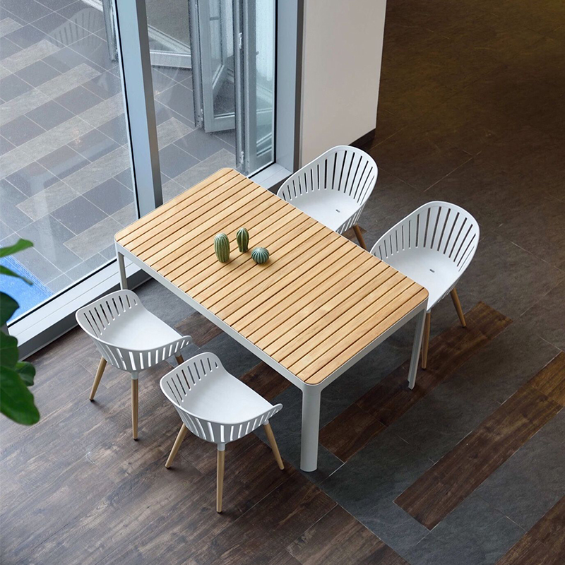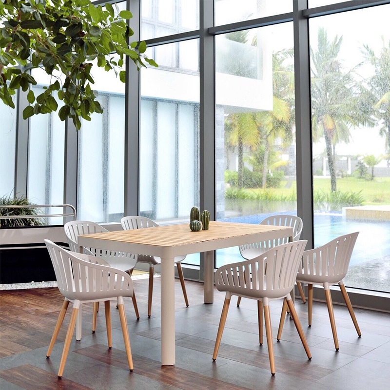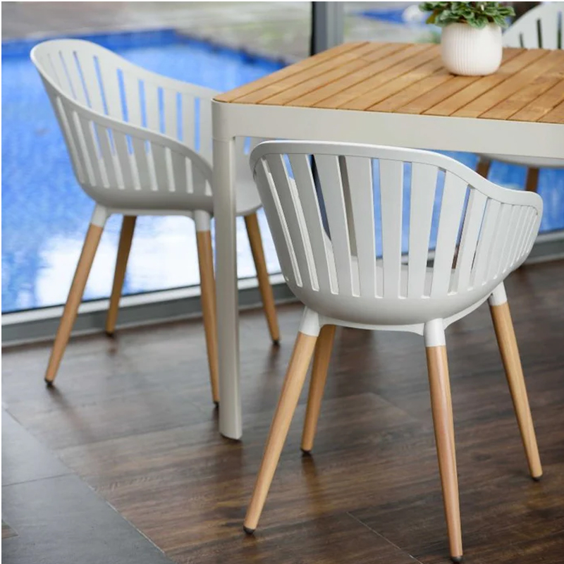 Bộ bàn ghế sân vườn cao cấp này mang đậm tinh thần thiết kế Bắc Âu hiện đại: đường nét tối giản, thanh thoát nhưng vô cùng tinh tế. Mặt bàn được làm từ gỗ nhựa Duraboard tone sáng tự nhiên, kết hợp khung hợp kim nhôm sơn tĩnh điện chống gỉ sét, bền đẹp theo thời gian.