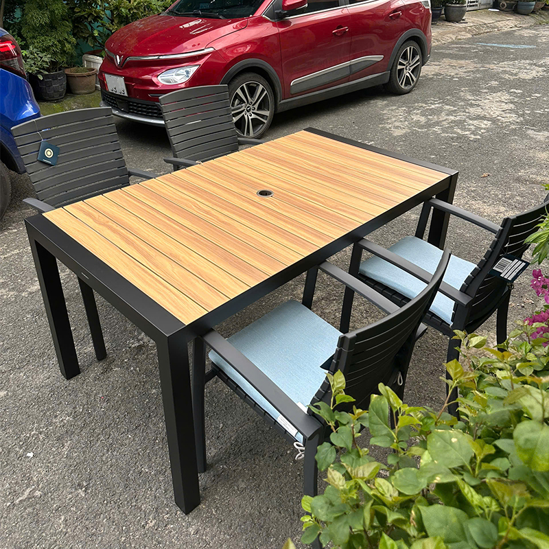 Bộ bàn ghế sân vườn nhôm cao cấp, mặt bàn sơn tĩnh điện màu vân gỗ sang trọng, ghế tặng kèm nệm ngồi êm ái. Bền đẹp – hiện đại – phù hợp mọi không gian ngoài trời.